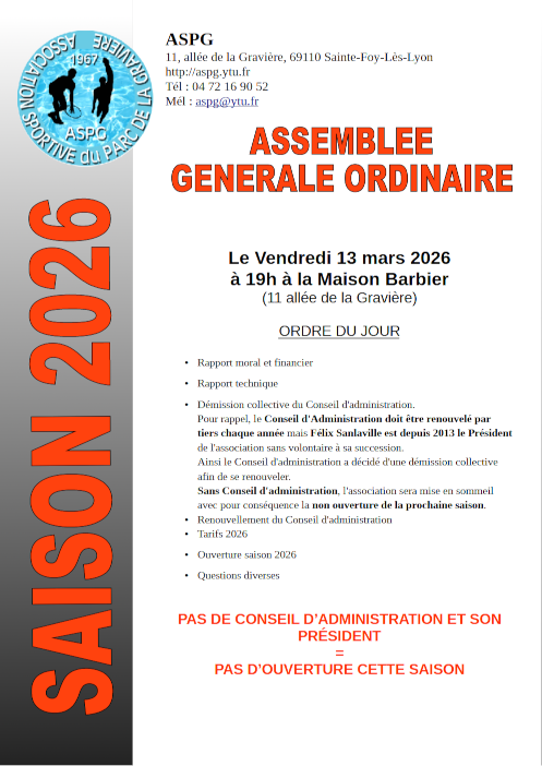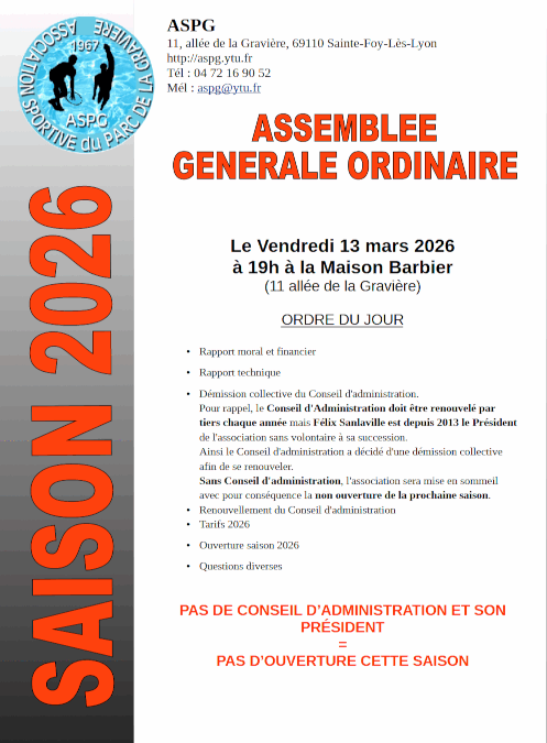 Suite à la démission de l’entièreté du Conseil d’administration, l’ASPG réalisera son Assemblée Générale Ordinaire