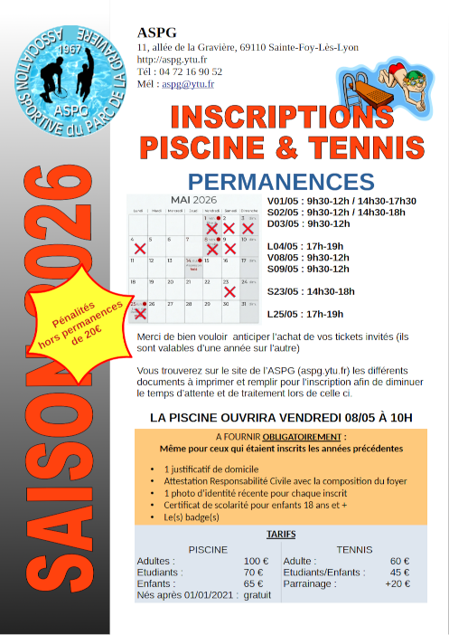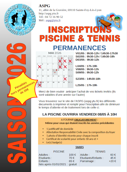 Les permanences pour les inscriptions aux activités Piscine et Tennis :
